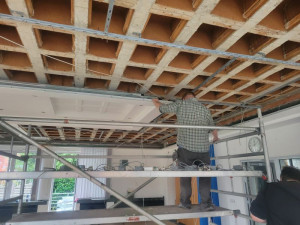 Mit vereinten Kräften haben unsere ehrenamtlichen Helfer heute die alte Decke vollständig demontiert und alle 32 Leuchtstofflampen fachgerecht abgebaut. Die bisherige Konstruktion aus mit Stoff bespannten Metallrahmen und veralteter Beleuchtung wich damit dem ersten Schritt in Richtung einer modernen Lösung.
